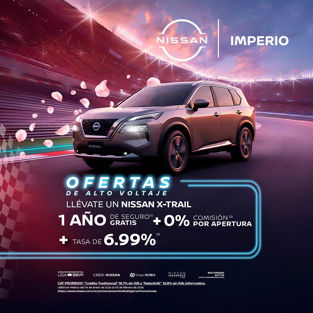 Las imágenes son únicamente de referencia, algunas versiones no se encuentran disponibles en México o pueden cambiar según la versión. Consulta nivel de equipamiento y disponibilidad por versión en tu Distribuidor Autorizado Nissan. CAT PROMEDIO “Crédito Tradicional” 18.7% sin IVA y “Selectiviti” 16.8% sin IVA, informativo. Válido en México del 06 de enero al 03 de febrero de 2026.