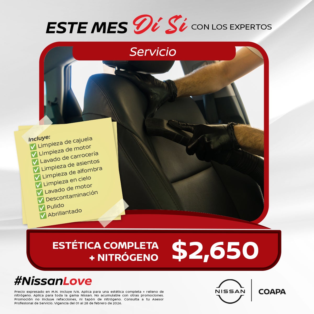 Precio expresado en M.N. Incluye IVA. Aplica para una estética completa + relleno de nitrógeno. Aplica para toda la gama Nissan. No acumulable con otras promociones. Promoción no incluye refacciones, ni tapón de nitrógeno. Consulta a tu Asesor Profesional de Servicio. Vigencia del 01 al 28 de febrero de 2026.