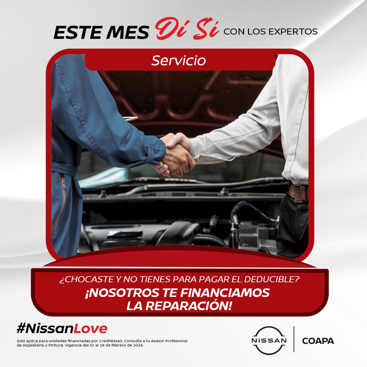 Solo aplica para unidades financiadas por CrediNissan. Consulta a tu Asesor Profesional de Hojalatería y Pintura. Vigencia del 01 al 28 de febrero de 2026.