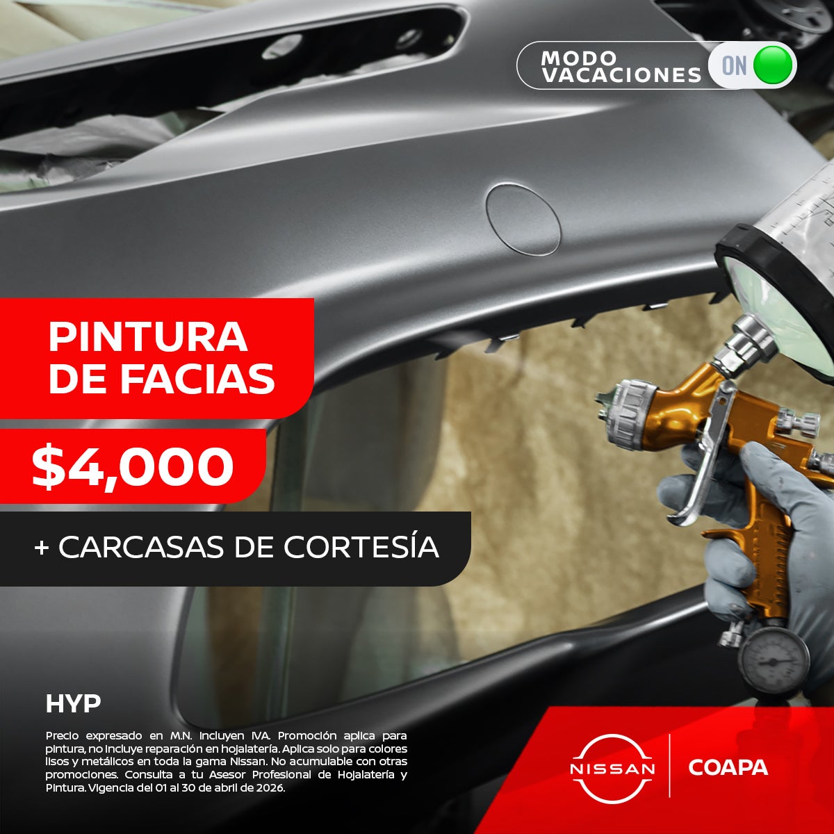 Precio expresado en M.N. Incluyen IVA. Promoción aplica para pintura, no incluye reparación en hojalatería. Aplica solo para colores lisos y metálicos en toda la gama Nissan. No acumulable con otras promociones. Consulta a tu Asesor Profesional de Hojalatería y Pintura. Vigencia del 01 al 30 de abril de 2026.