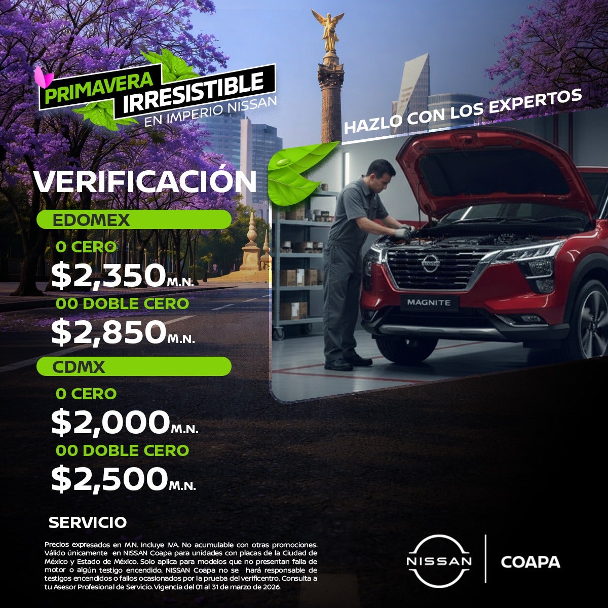 Precios expresados en M.N. Incluye IVA. No acumulable con otras promociones. Válido únicamente en NISSAN Coapa para unidades con placas de la Ciudad de México y Estado de México. Solo aplica para modelos que no presentan falla de motor o algún testigo encendido. NISSAN Coapa no se hará responsable de testigos encendidos o fallos ocasionados por la prueba del verificentro. Consulta a tu Asesor Profesional de Servicio. Vigencia del 01 al 31 de marzo de 2026.