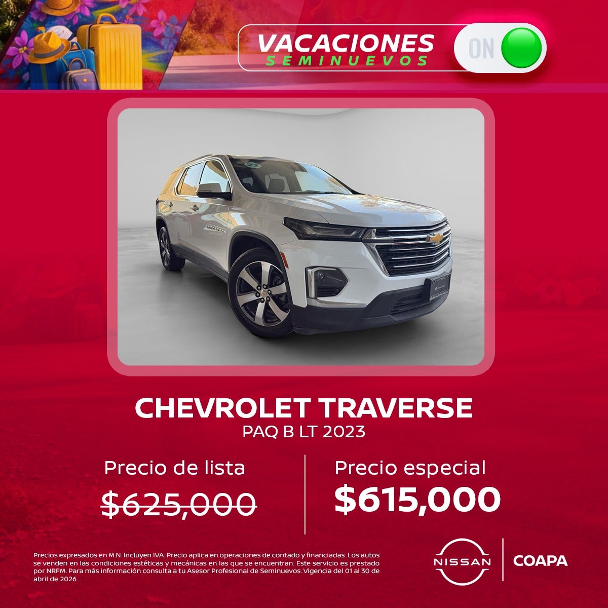 Precios expresados en M.N. Incluyen IVA. Precio aplica en operaciones de contado y financiadas. Los autos se venden en las condiciones estéticas y mecánicas en las que se encuentran. Este servicio es prestado por NRFM. Crédito sujeto a previa aprobación. Para más información consulta a tu Asesor Profesional de Seminuevos. Vigencia del 01 al 30 de abril de 2026.