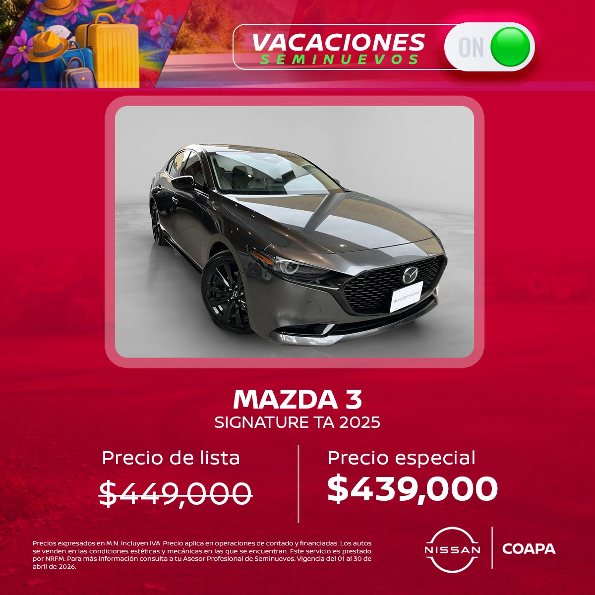 Precios expresados en M.N. Incluyen IVA. Precio aplica en operaciones de contado y financiadas. Los autos se venden en las condiciones estéticas y mecánicas en las que se encuentran. Este servicio es prestado por NRFM. Crédito sujeto a previa aprobación. Para más información consulta a tu Asesor Profesional de Seminuevos. Vigencia del 01 al 30 de abril de 2026.