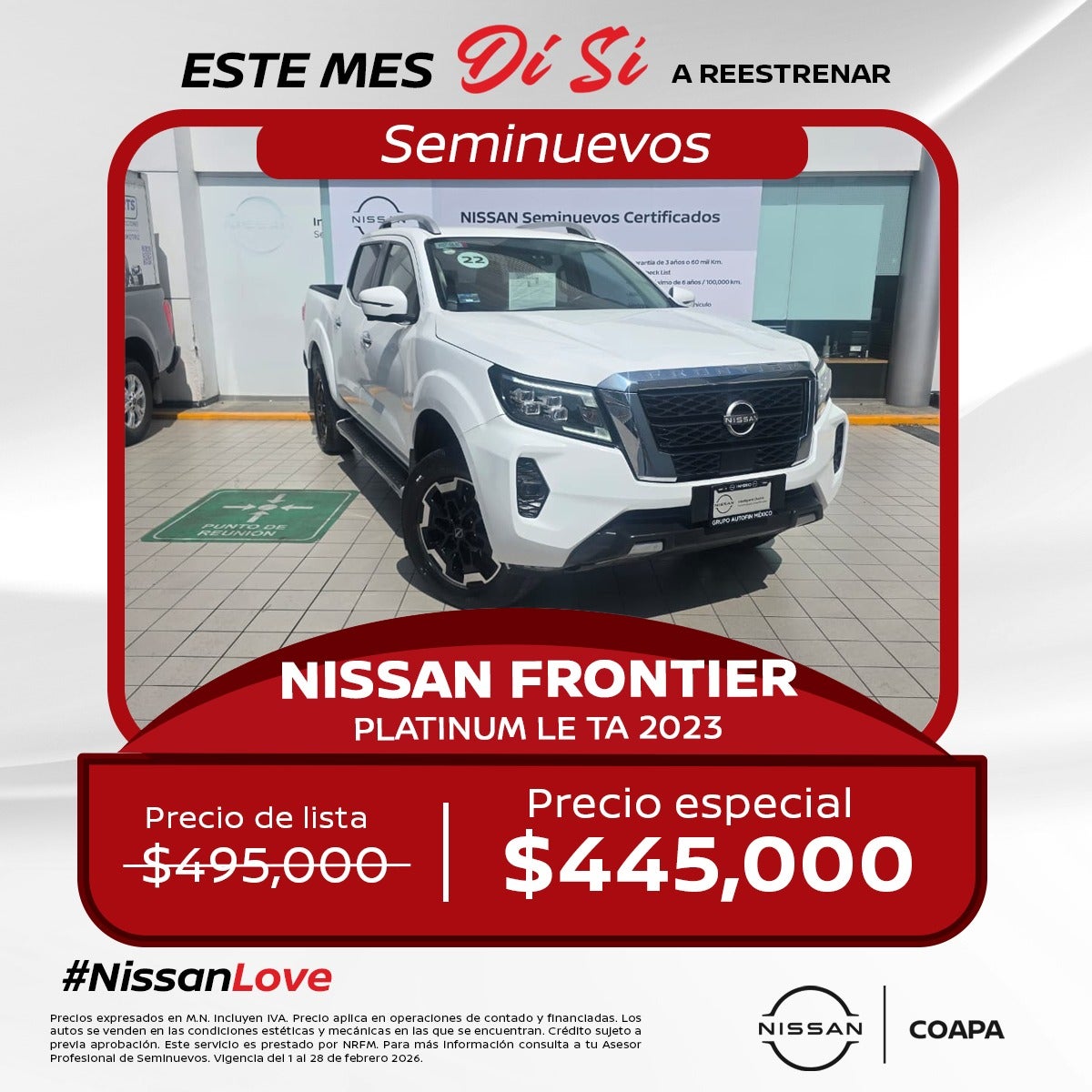 Precios expresados en M.N. Incluyen IVA. Precio aplica en operaciones de contado y financiadas. Los autos se venden en las condiciones estéticas y mecánicas en las que se encuentran. Este servicio es prestado por NRFM. Crédito sujeto a previa aprobación. Para más información consulta a tu Asesor Profesional de Seminuevos. Vigencia del 1 al 28 de febrero 2026.