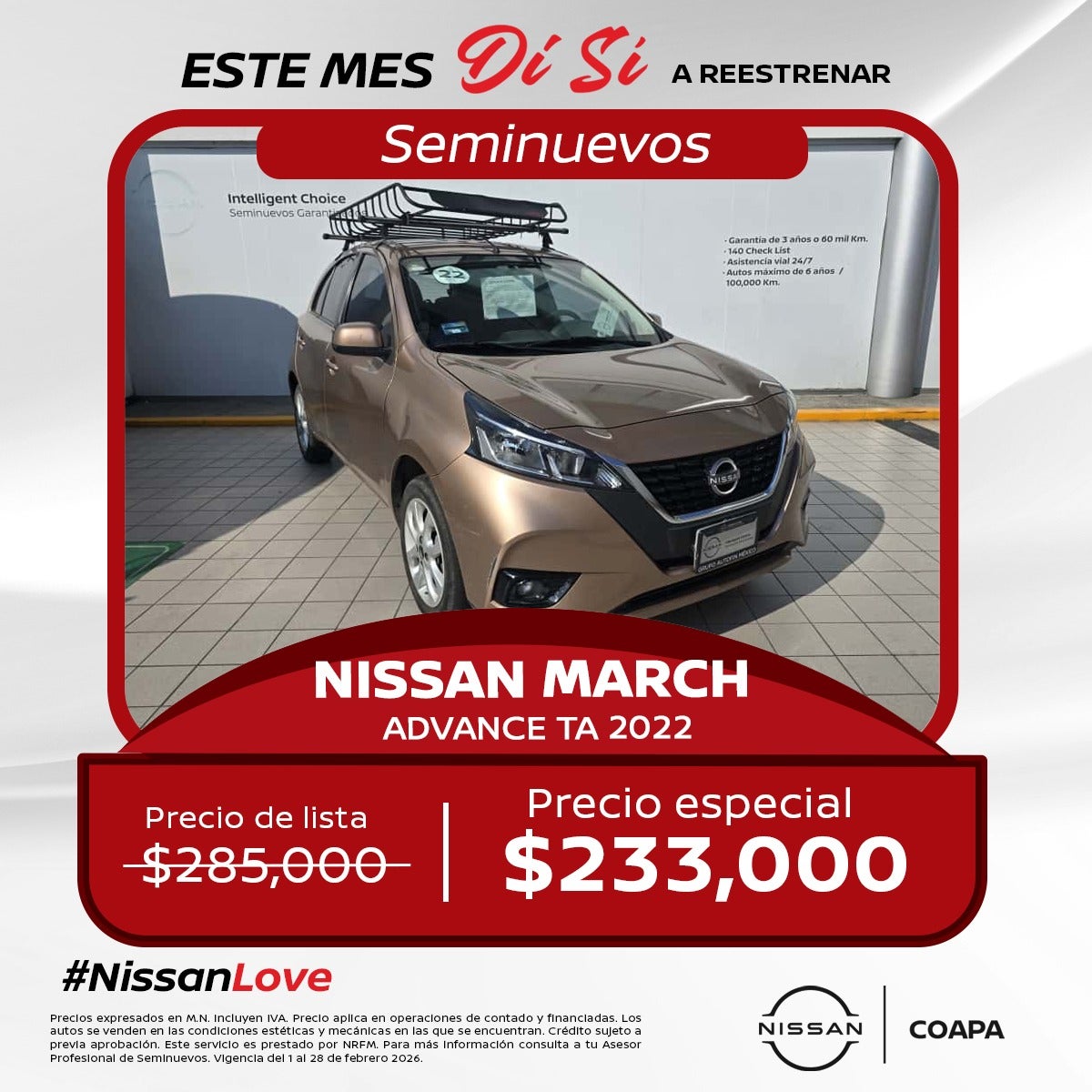 Precios expresados en M.N. Incluyen IVA. Precio aplica en operaciones de contado y financiadas. Los autos se venden en las condiciones estéticas y mecánicas en las que se encuentran. Este servicio es prestado por NRFM. Crédito sujeto a previa aprobación. Para más información consulta a tu Asesor Profesional de Seminuevos. Vigencia del 1 al 28 de febrero 2026.