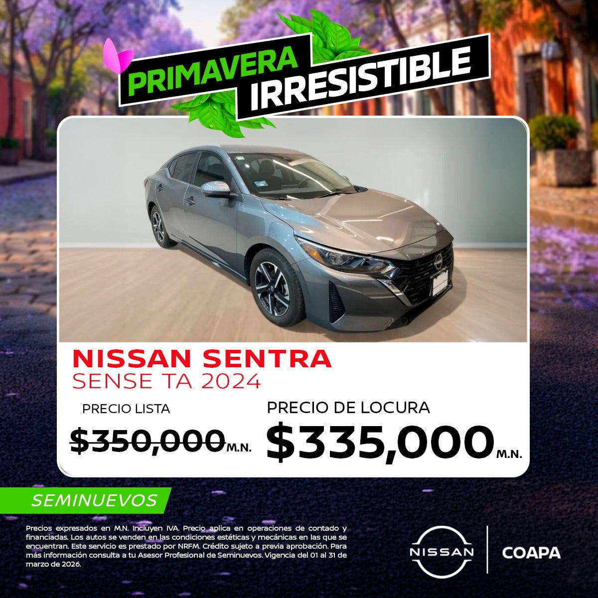 Precios expresados en M.N. Incluyen IVA. Precio aplica en operaciones de contado y financiadas. Los autos se venden en las condiciones estéticas y mecánicas en las que se encuentran. Este servicio es prestado por NRFM. Crédito sujeto a previa aprobación. Para más información consulta a tu Asesor Profesional de Seminuevos. Vigencia del 01 al 31 de marzo de 2026.