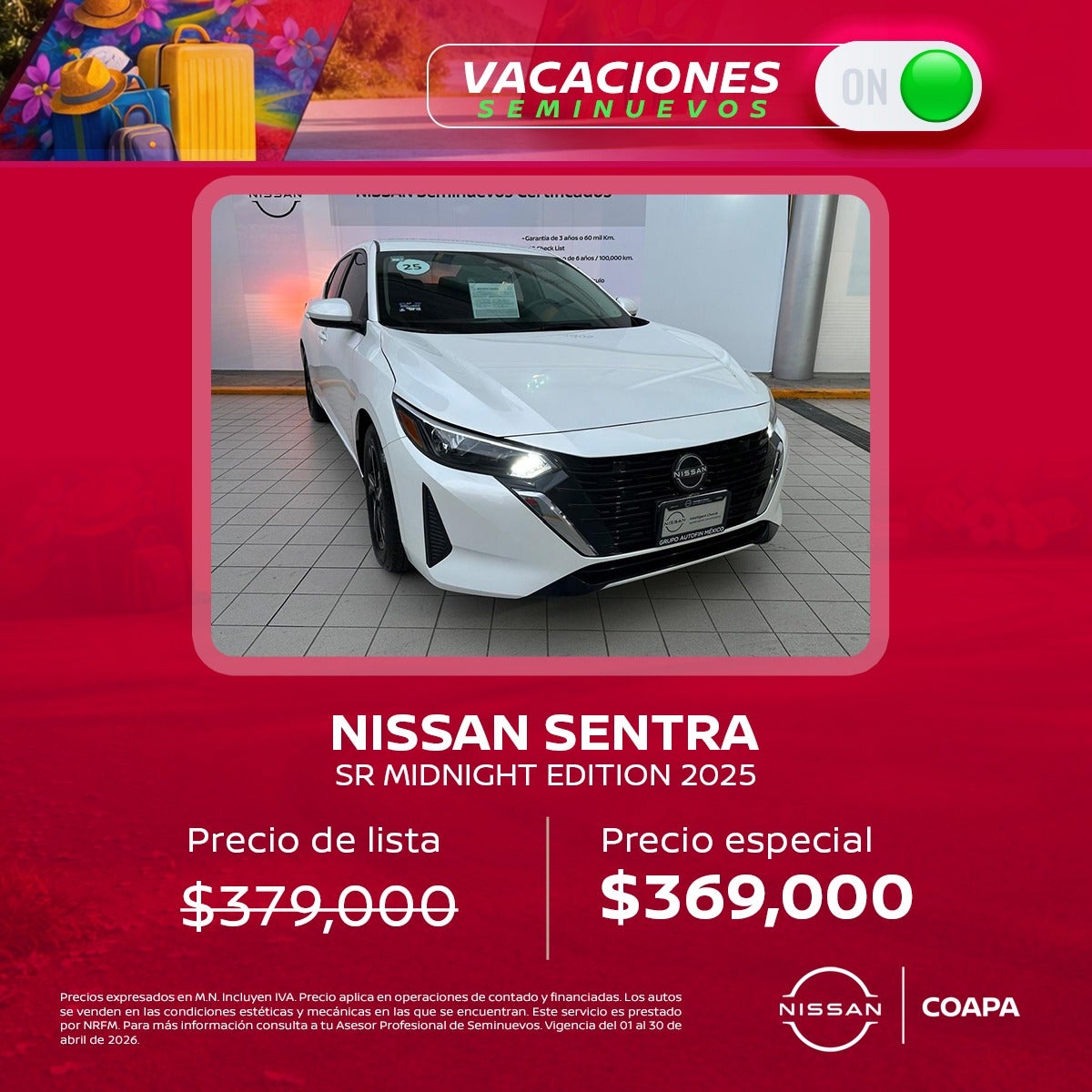 Precios expresados en M.N. Incluyen IVA. Precio aplica en operaciones de contado y financiadas. Los autos se venden en las condiciones estéticas y mecánicas en las que se encuentran. Este servicio es prestado por NRFM. Crédito sujeto a previa aprobación. Para más información consulta a tu Asesor Profesional de Seminuevos. Vigencia del 01 al 30 de abril de 2026.